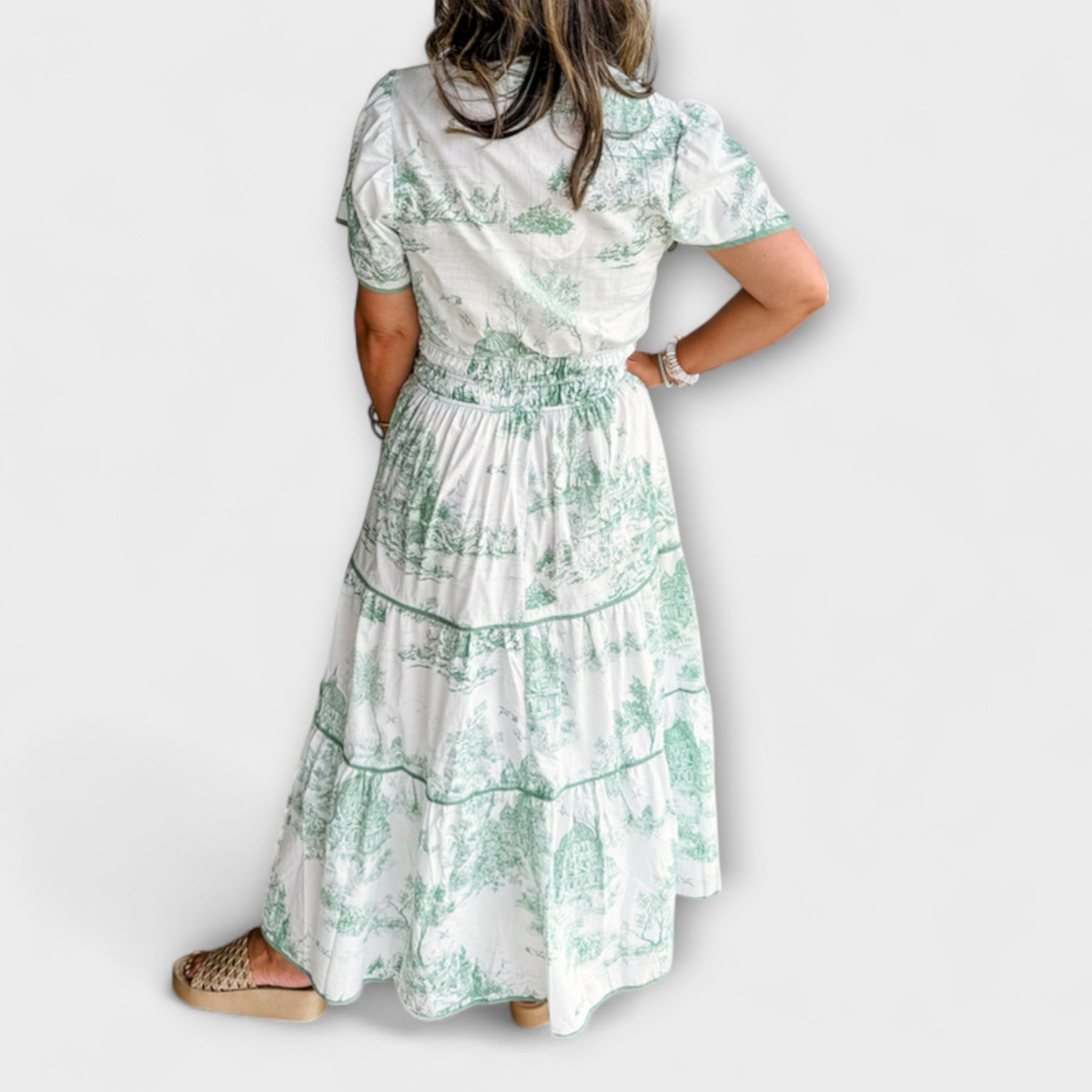 Pretstavljamo Elizu | Klasična maxi haljina s uzorkom – Vaš savršeni pratitelj za proljetne dane i vrtne zabave! Ovaj bezvremenski komad bez napora spaja elegantan izgled s maksimalnom udobnošću i ima zapanjujući zeleni i bijeli uzorak koji isijava klasični romantizam.