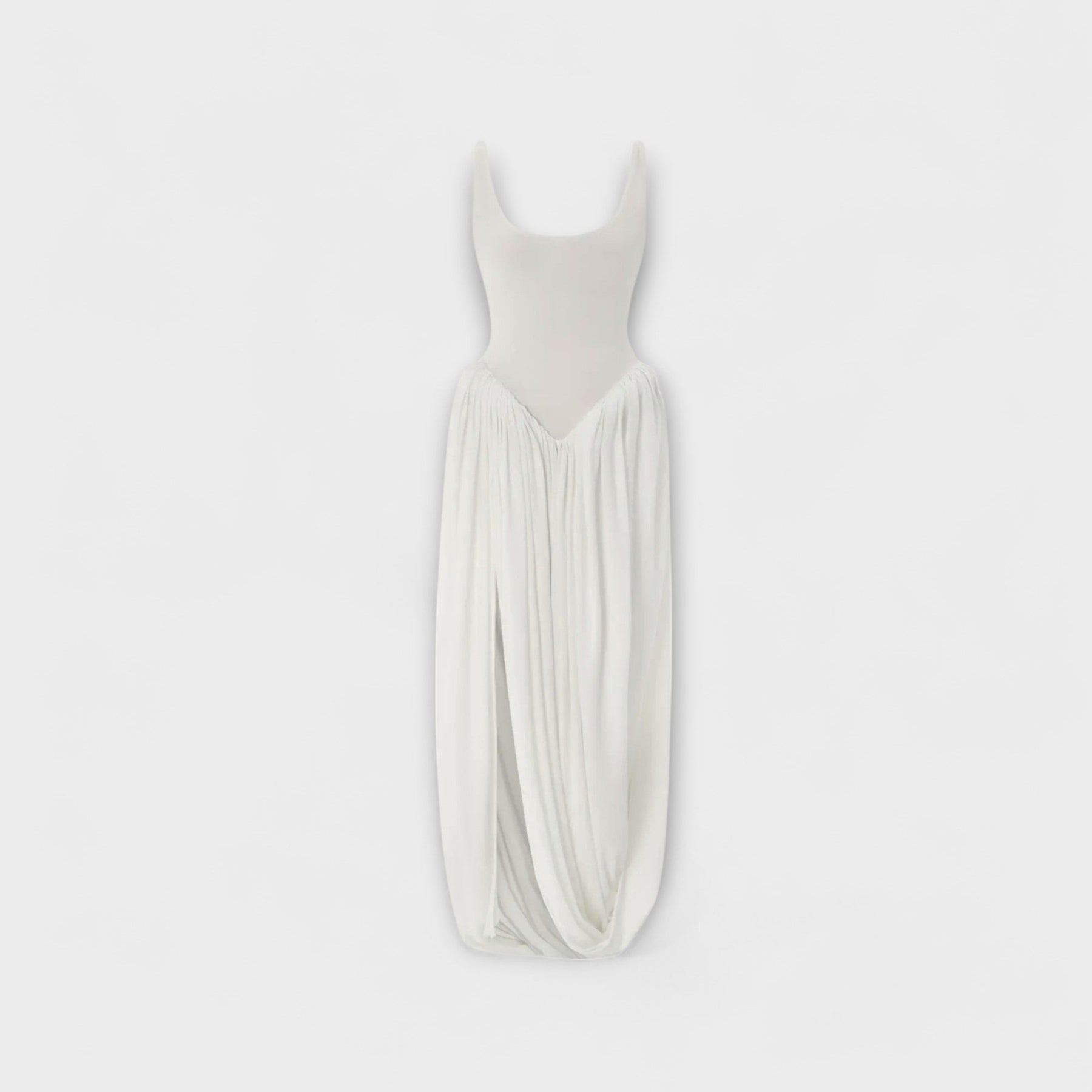 Otkrijte naše bijele drapirane maxi haljine koje imaju skulpturalnu suknju i bočni prorez.