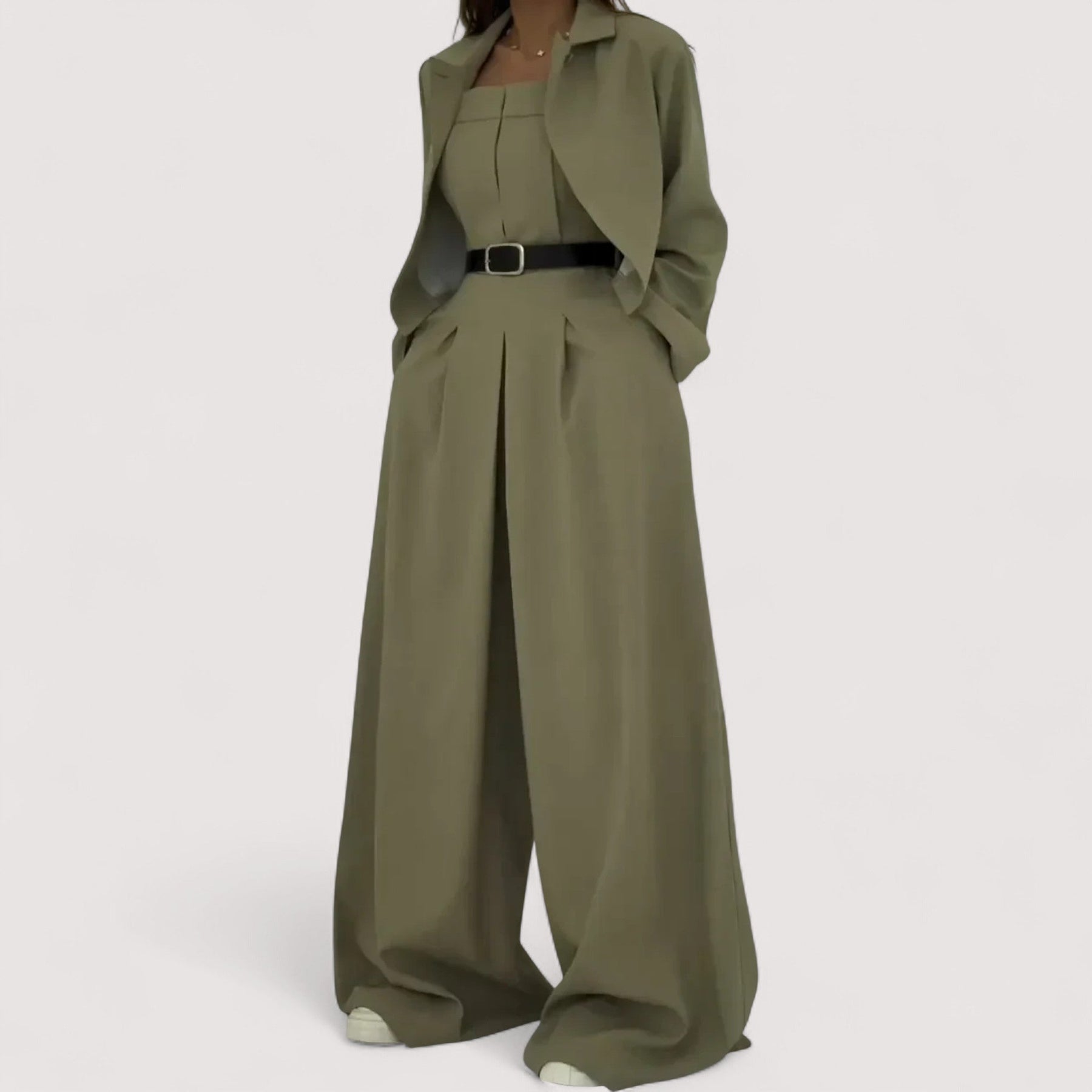S ultra-trendi, širokim hlačama, strukturiranim bustierom i pripadajućom lepršavom jaknom, ovaj je set dizajniran da naglasi sve siluete.