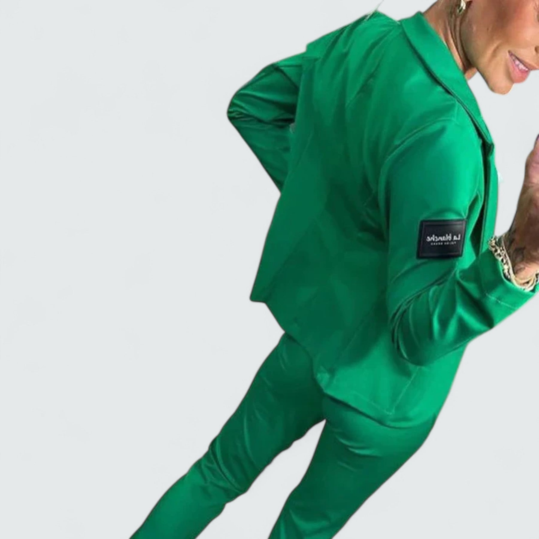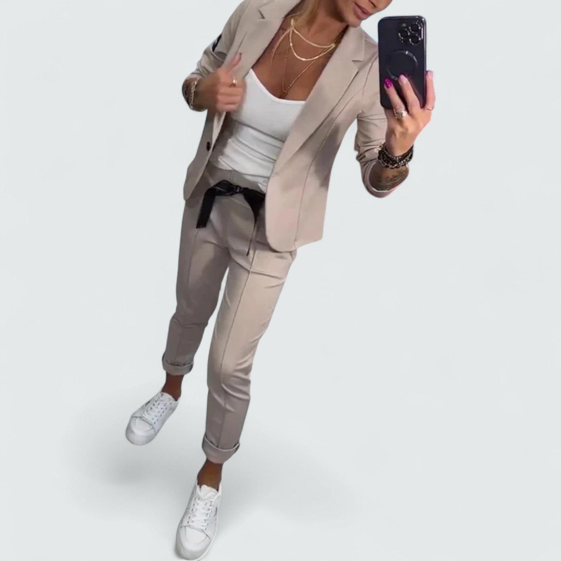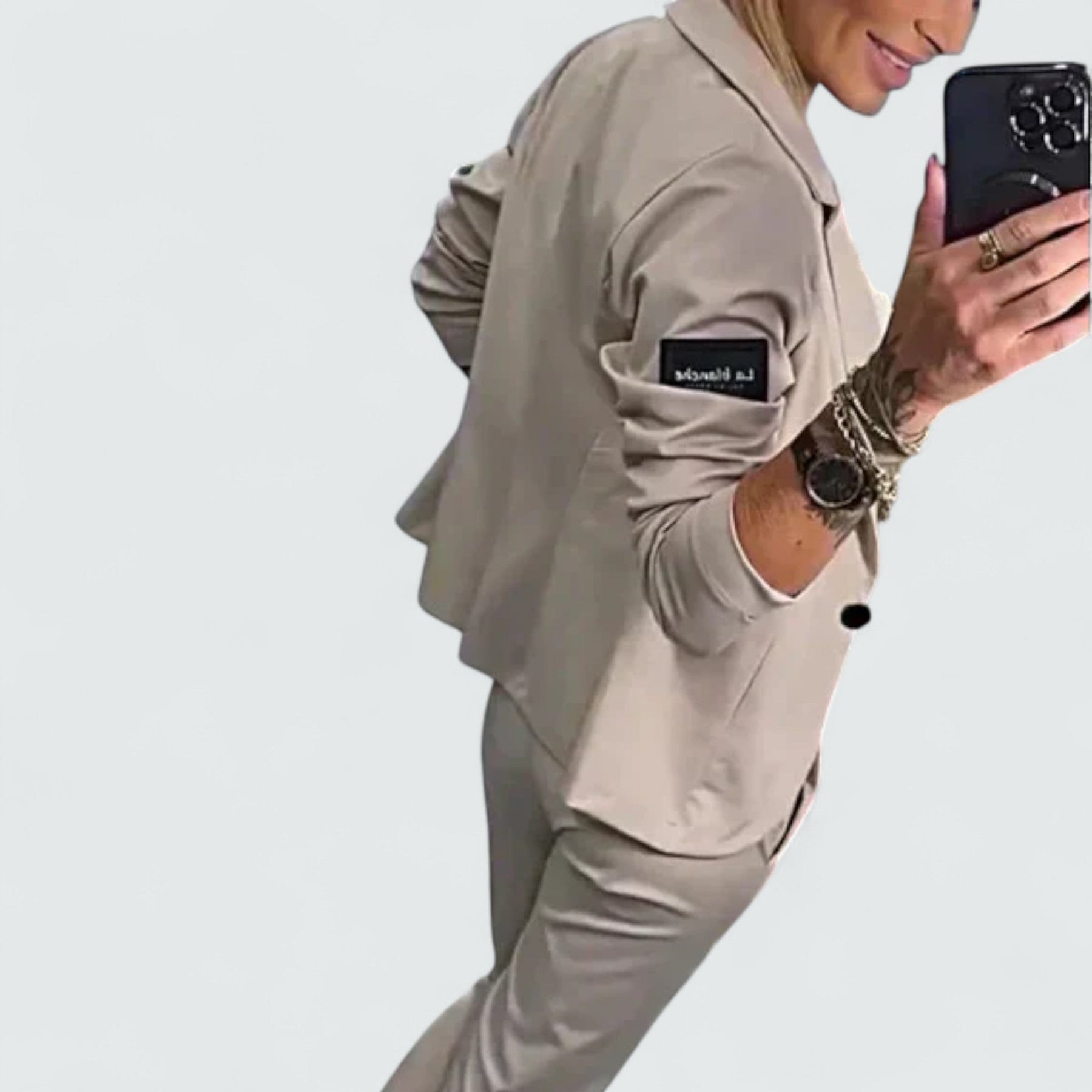 Uronite u nenametljiv stil s ovim elegantnim kompletom blazer + hlače za jogu. Krojeni blazer i ležerne hlače savršen su izbor za radne dane ili vikende u pokretu.