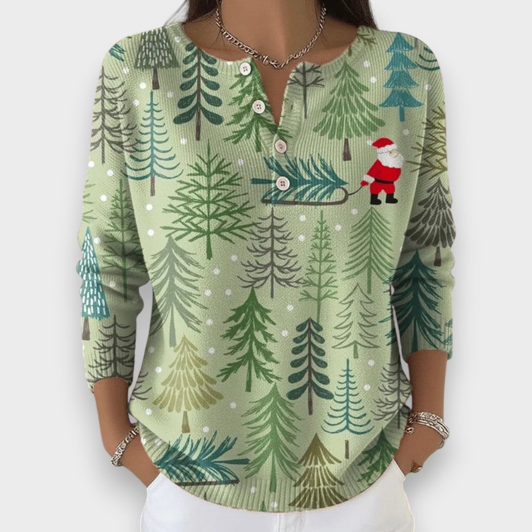 Pulover Simona odmah donosi božićnu atmosferu sa svojim veselim uzorkom borovih grana, pahulja i crvenih cvjetnih akcenata. Mekana, pletena tkanina ugodna je na dodir i grije vas tijekom ugodnih zimskih dana. Dekorativna gumbna zatvaranja na vratu dodaju razigran i ženstven detalj ovom prazničnom izgledu.